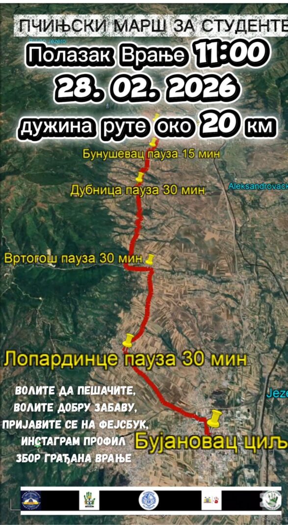 Kao što smo već objavili u subotu se organizuje pešačenje od Vranja do Bujanovca u znak podrške studentima i njihovoj borbi za pravdu i slobodu.