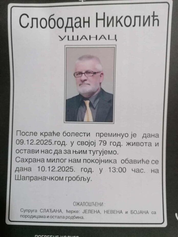 Advokat Slobodan Nikolić – Ušanac preminuo je 9. decembra u Vranju posle kraće bolesti.