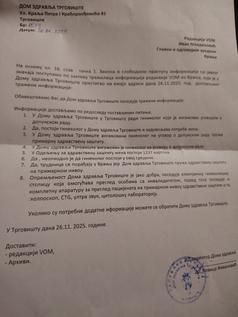 Tragom informacije da uprkos činjenici da pri Domu zdravlja postoji Služba za zdravstvenu zaštitu žena u njoj rade samo medicinske sestre dok je ginekolog, najverovatnije iz Vranja angažovan, po ugovoru o dopunskom radu poslali smo zahtev za informacije od javnog značaja ovoj zdravstvenoj ustanovi.