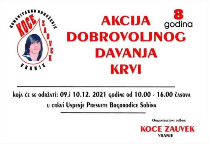 Tradicionalno i ove godine Humanitarno udruženje Koce zauvek, organizovaće akciju dobrovoljnog davanja krvi, koja će se odrvijati dva dana 9. i 10. decembra u crkvi Uspenje Presvete Bogorodice u Sobini, najavili su organizatori.