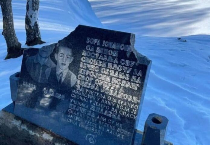 Oštećen spomenik na Vlasinskom jezeru podigla je porodica niškog učitelja Videna Jovanovića koji se utopio 1998. godine pokušavajući da pomogne učeniku Mladenu Pejčiću.